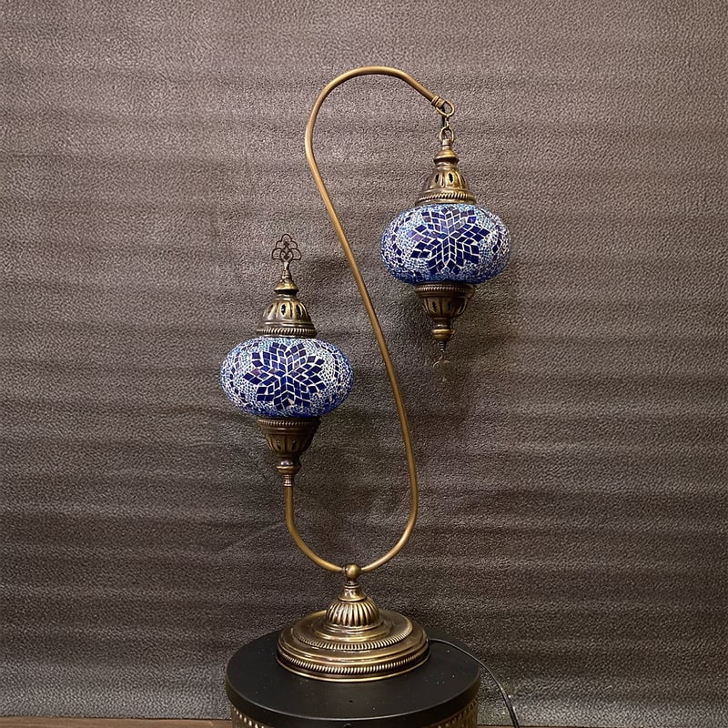 Grandbazaarist Double Shade Blue Mosaic Turkish Filigree Table Lamp